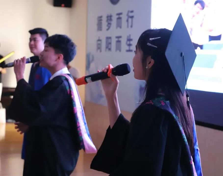 最后的串烧歌曲点燃了会场的气氛,毕业生们一起合唱歌曲,一首《我会等》“与你一起去看外面世界到底多大”等着一起去探索世界、共赴未来,一首《起风了》“仍感叹于世界之大”心动随风起,今日成就了独一无二的盛夏。一首《稻香》“为自己的人生涂上鲜艳的颜色”共同期盼着青春五彩斑斓的模样。一首《一路生花》“我希望许过的愿望一路生花”祝福所有毕业生前程似锦、心想事成。一首《再见》“我会珍惜你的思念”在这个流行离开的时代,能够带着美好回忆好好的道别。