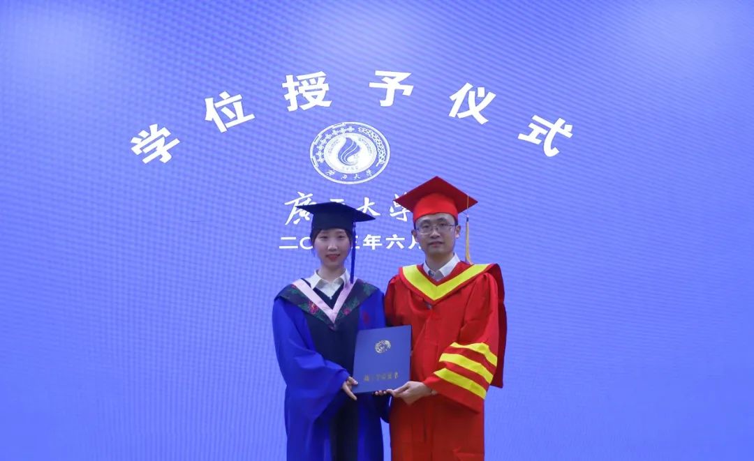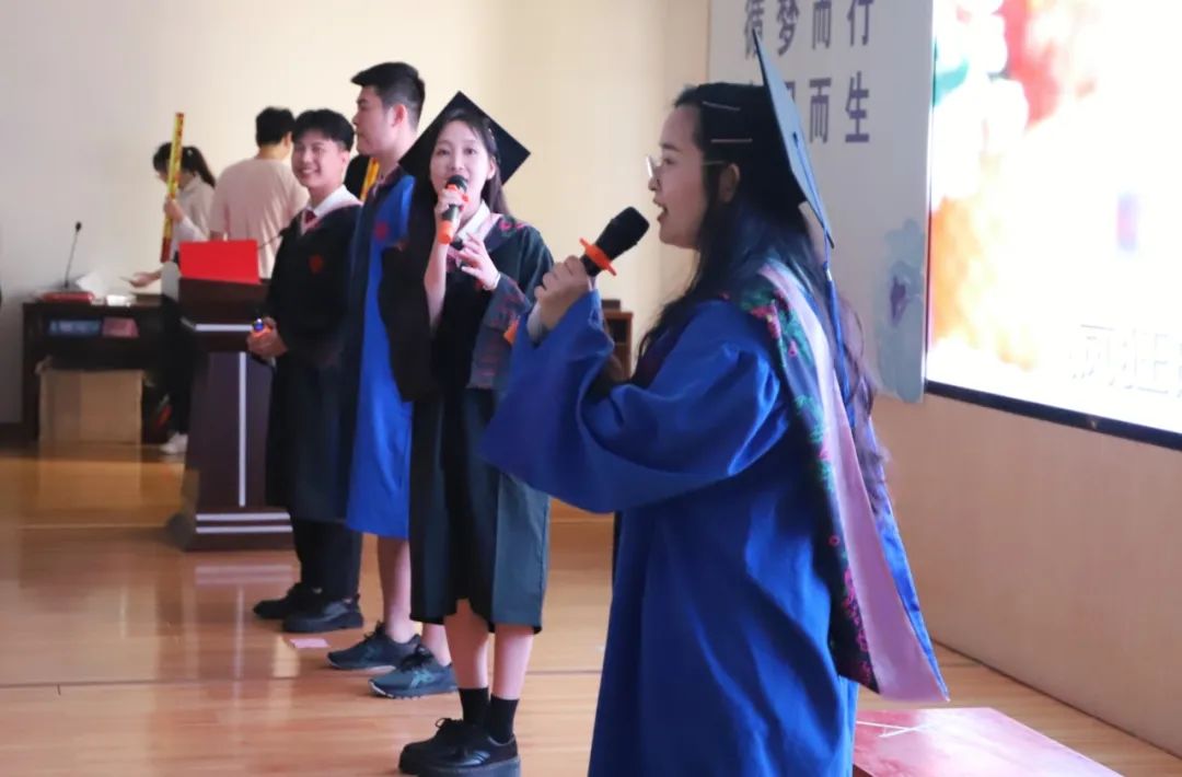 副院长周均旭致辞并宣读学位授予决定,随后本科、学术型硕士毕业生按顺序依次上台接受学位授予。毕业班班主任老师为每一位上台的毕业生整理衣冠,聂鑫、史云贵为获得学位的毕业生行拨穗礼并授予学位证书,庞惠等老师与获得学位的毕业生握手、拥抱,祝贺其顺利毕业。