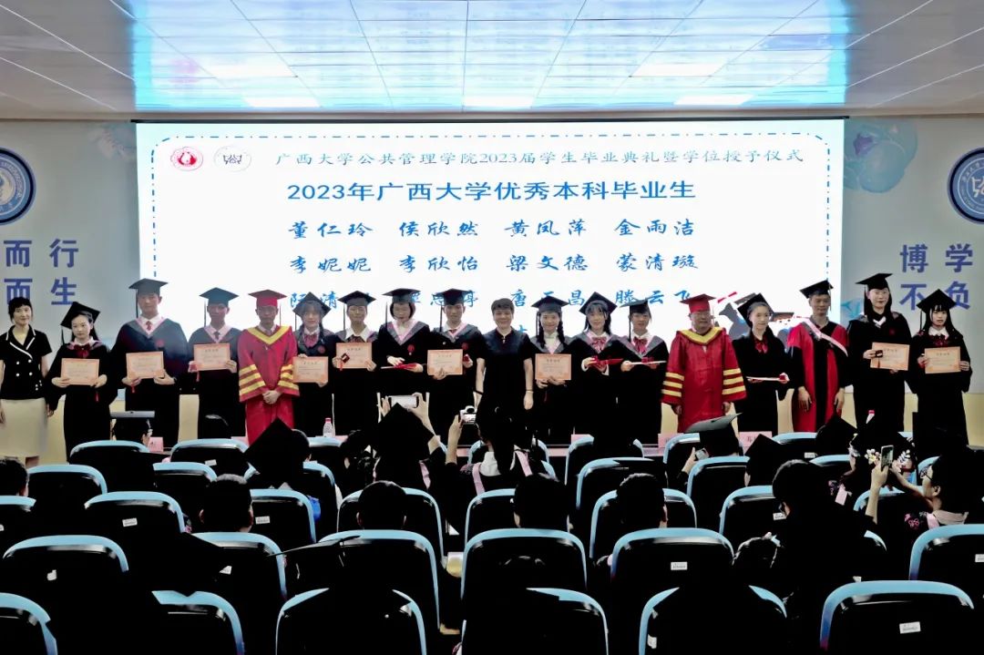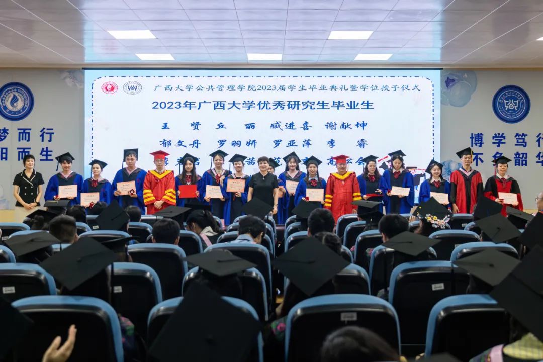 教师代表黎昌珍、罗树杰、叶大凤、吴凡、李小红、苏毅清、覃伟华、黄六招,办公室主任龚丽华,院团委书记黄文静,院团委副书记刘佩瑶,毕业班班主任,太阳城网址 教学办、研究生办、MPA中心的各位老师及全体本科、学硕毕业生参加典礼。