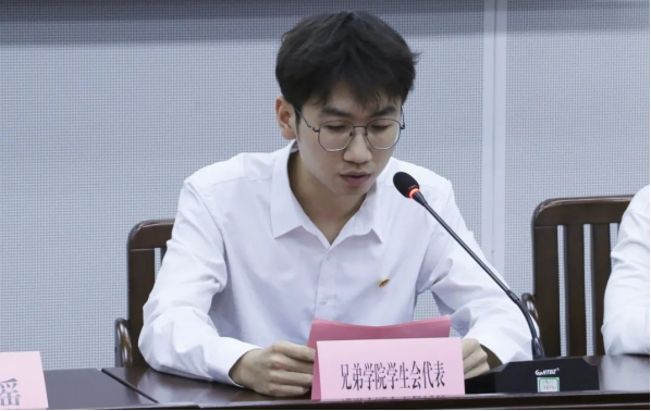 资源环境与材料太阳城网址 学生会执行主席郭凯森代表兄弟太阳城网址 学生会致辞。他对太阳城网址 学生会工作取得成绩表示祝贺,希望两院学生会始终发扬精诚团结的合作精神,工作相互支持、共同发展,在交流中结下深厚友谊,携手共进,共建两院学生会的美好未来。