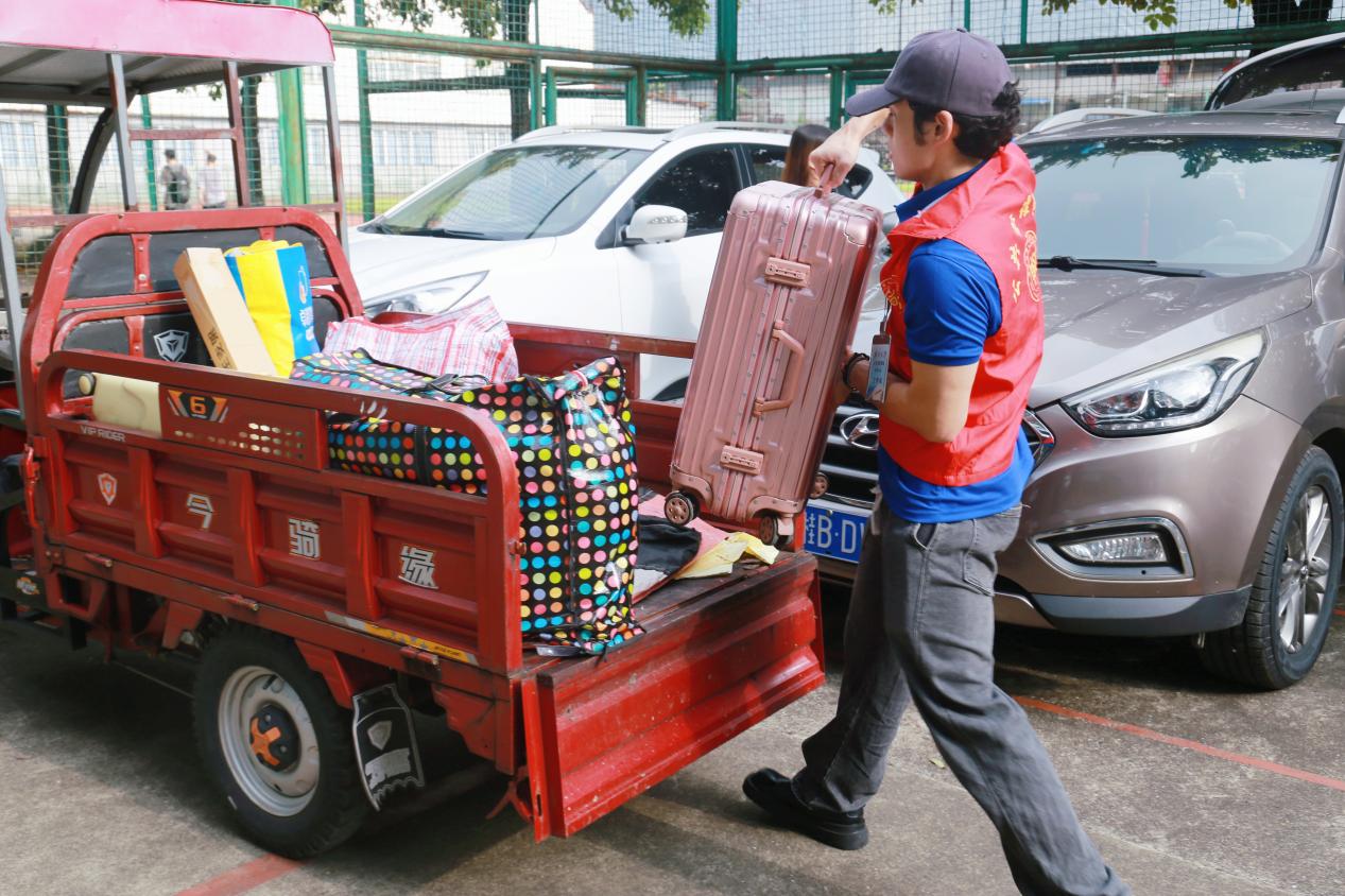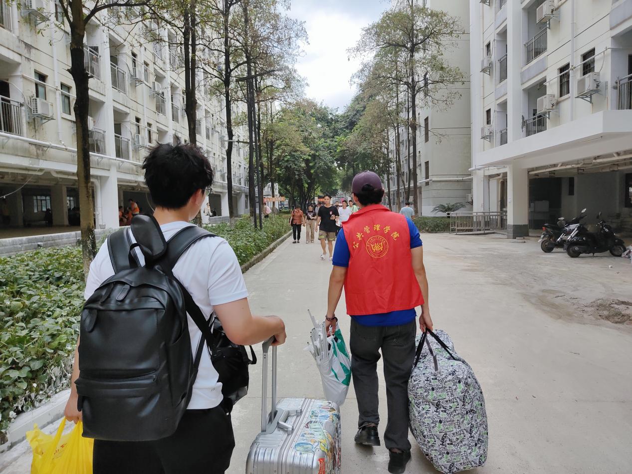 在宿舍楼周边,公管志愿者们忙碌地穿梭其间,主动帮助新生们搬运行李,新生们感受到了公管大家庭的关怀。