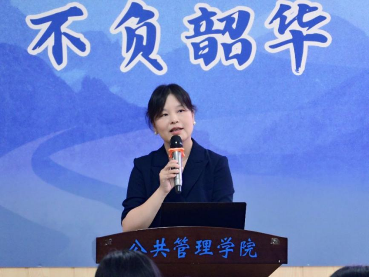 随后,2025级新生代表杨馨闻发言,讲述了自己的工作经历、考研感悟和读研规划。她表示,在作为选调生参与驻村工作的过程中,她逐渐发现自己在公共管理领域的理论储备跟不上服务群众的实践需求,从此下定了考取公共管理研究生的决心;以此鼓励同学们不忘初心,坚持把理论知识运用到服务人民的工作实践中。在读研规划上,她勉励自己和同学们要多读公共管理专著和论文,多参与调研项目和学科竞赛,锻炼知识运用技能;多关注政策文件,多去走访调研了解民生需求,为基层治理优化、服务民生福祉贡献自己的力量。