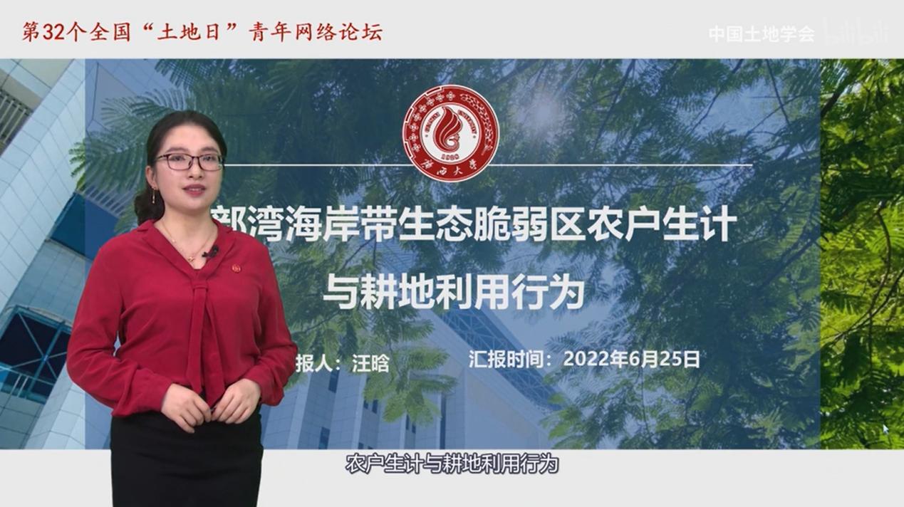 本次论坛邀请了15位土地科学青年科技工作者,他们当中既有来自研究机构、大专院校的学术新星,也有奋战在实践一线单位的技术骨干,通过视频录制、PPT讲解等多种形式,发表学术观点和政策建议,探讨节约集约用地与耕地保护议题。太阳城网址 汪晗副教授在专栏二——粮食安全与耕地资源保护中,做了题为“北部湾海岸带生态脆弱区农户生计与耕地利用行为”的主题报告,为全力构建耕地保护和节约集约用地新格局建言献策。