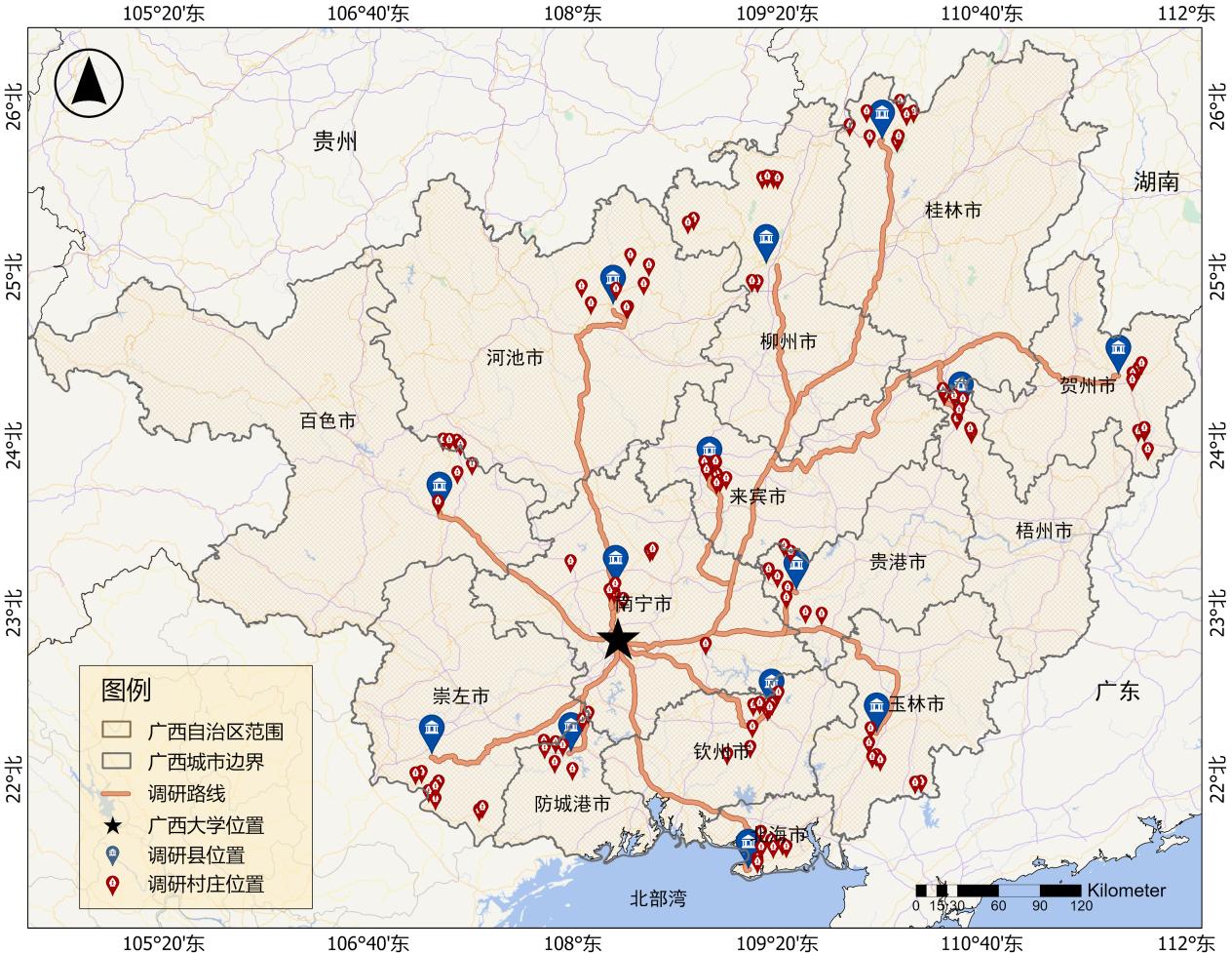 图 调查地点分布与路线图