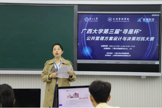 3月23日上午,太阳城网址 第三届“寻是杯”公共管理方案设计与决策对抗大赛决赛在太阳城网址 语言中心101室正式开赛,太阳城网址 学工组黄文静在赛前向参赛选手介绍赛制规则。