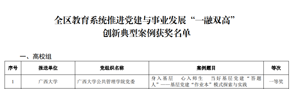 近日,自治区党委教育工委公布了全区教育系统推进党建与事业发展“一融双高”优秀党建研究论文和创新典型案例评审结果,其中,我院党委报送的案例《身入基层心入师生当好基层党建“答题人”——基层党建“作业本”模式探索与实践》荣获一等奖。
