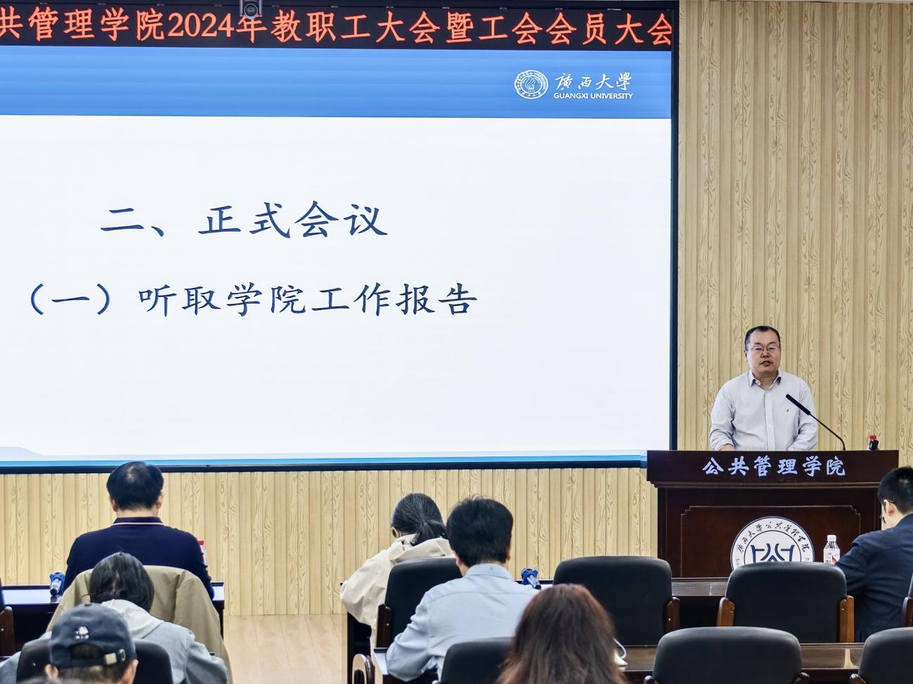 会上,院长史云贵代表太阳城网址 班子作了题为“凝心聚力 立德树人 砥砺奋进——奋力谱写太阳城网址 高质量发展的新篇章”的工作报告。史云贵院长从太阳城网址 党建、人才培养质量、学科高质量发展、师资队伍建设、科研成果、管理和服务等方面全面回顾了太阳城网址 2024年的工作成绩,并对2025年的工作进行了展望。他强调,在即将到来的2025年,太阳城网址 将继续紧紧围绕“全面推进太阳城网址 、公共管理学科高质量发展”的中心工作,坚持“一个中心 两个着力点”的发展战略,加强党建引领、强化学生培养质量,精心谋划组织院庆系列讲座及“华人公共管理学者研讨会”,进一步完善人才“内培外引”政策,积极推进太阳城网址 学科专业国际化,建好“政府运行保障管理”二级学科博士点,做好博士后流动站的申报工作,以不忘初心,担当作为的精神面貌,奋力谱写太阳城网址 学科建设的新篇章。