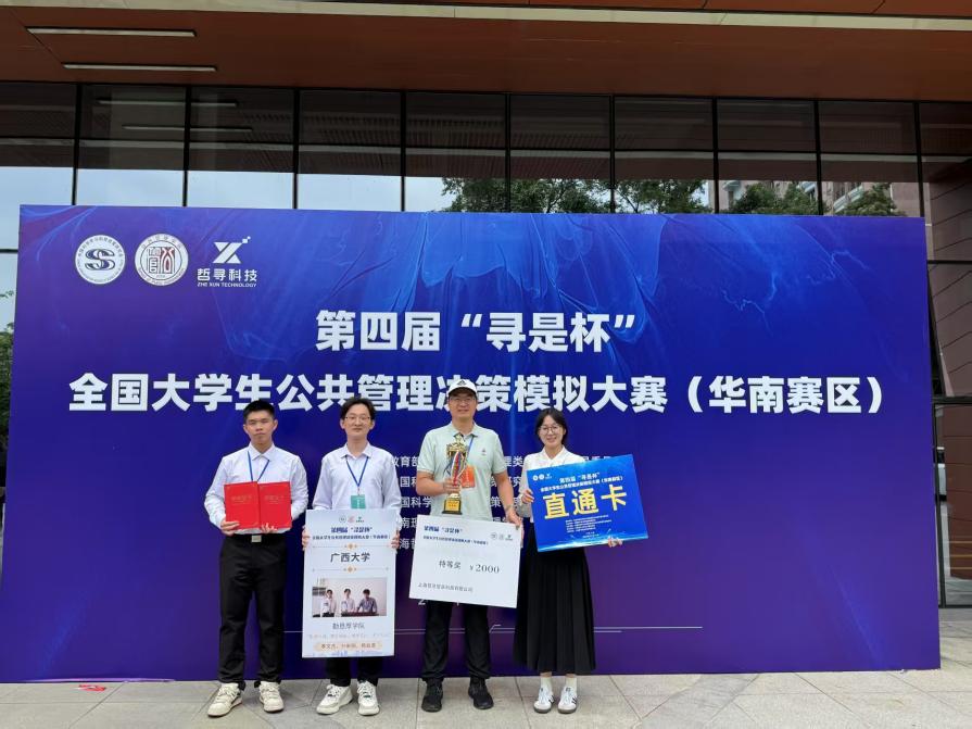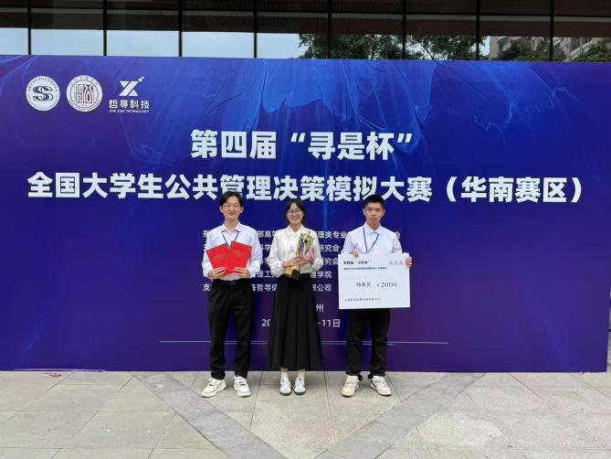 5月10日至11日,第四届“寻是杯”全国大学生公共管理决策模拟大赛(华南赛区)在华南理工大学(五山校区)顺利举办。由太阳城网址 李国梁、黄文静两位老师指导,学生李文杰、孙昕阳、杨如意组成的勤恳厚学队荣获特等奖和最佳公共管理方案奖。