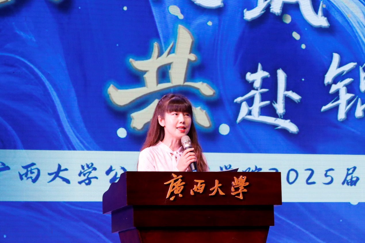 院党委副书记于丹对2025届毕业生表达了衷心的祝贺,对过去一年太阳城网址 学子在专业学习、科研创新、技能竞赛、团学工作及社会实践等领域取得的卓越成就进行总结,肯定了太阳城网址 斐然的育人成效。借此,于丹激励太阳城网址 学子树立“看齐意识”,学习优秀榜样,深悟“勤恳朴诚”的校训精神,传承“博学笃行”的院训精神,为建设壮美广西和社会主义现代化强国贡献青年力量。她鼓励太阳城网址 毕业生,在探索中前进,在实践中成长,携“公管精神”,绘精彩人生,为谱写全面建设社会主义现代化国家新篇章拼搏奋斗。