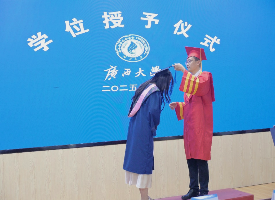 学位授予环节,副院长周均旭宣读学位授予决定,现场为优秀毕业生及荣获优秀学位论文的同学颁发荣誉证书,并与他们合影留念。随后,在礼乐声中,毕业生们依次有序走上台,院党委书记聂鑫亲自为每位毕业生行拨穗礼,并逐一与大家合影记录这一珍贵时刻。