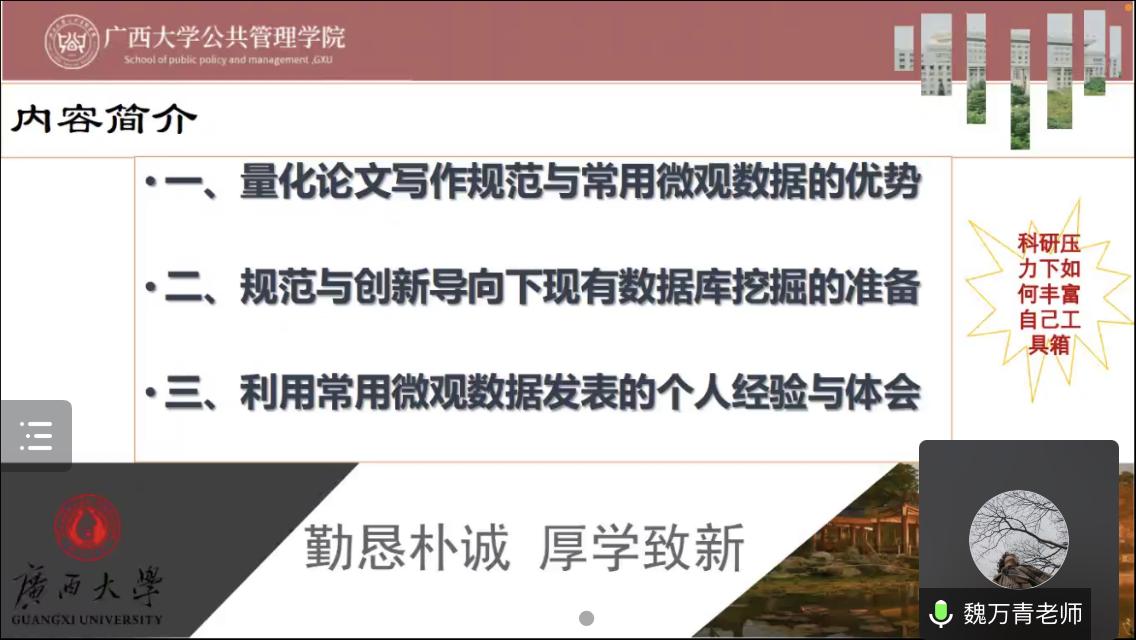 魏老师针对定量论文写作中如何对现有数据库进行挖掘与利用展开讲解。首先,魏老师阐明了量化论文写作规范与常用微观数据的优势。他介绍道,学术论文的基本结构与规范、量化研究基本要素、学术研究过程的特点与常见微观数据及其优势,并强调资料证据需具备科学性与说服力,善于借力于现有数据库。其次,魏老师说明了规范与创新导向下现有数据库挖掘的准备。他从“发表导向(想法与创新)、复制性研究(可信性革命)、模仿中创新(戴着镣铐跳舞)三个方面进行讲解,强调需围绕创新展开写作,研究需规范且可复制,在模仿优秀研究成果的基础上进行创新。最后,魏老师分享利用常用微观数据写作的个人经验与体会。他认为,利用常用微观数据进行定量写作分为以下四个步骤:第一,需从模仿起步,优化前人方法方法;第二,比较各类学科研究框架,实现视野多元化;第三,对研究问题进行因果分析,打开问题黑箱;第四,收集多重资料,实现优势互补。