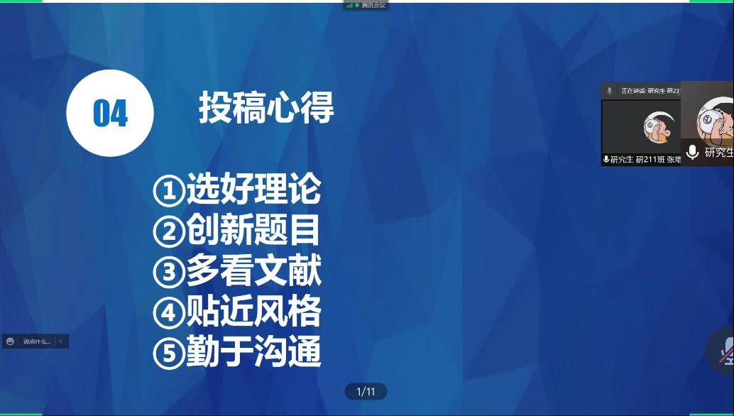 在提问环节,有同学向臧进喜同学提问:“请问应该如何选择投稿期刊呢?您有遇到退稿的情况吗?”臧进喜回答:“投稿期刊与你所写的文章有很大关联,因为每个期刊都有自己的风格和文章主题,你所写的文章和你所投期刊的风格相符才更有可能入选。我这篇文章没有遇到退稿的情况,主要还是修改文章”。也有同学提问:“所投的文章要与期刊风格相符,那如何才能尽可能做到相符呢?”臧进喜回答:“文章主题要与期刊往常所发表的文章主题相符,文章内容多样,不要求相仿;写作框架也要与已发表文章的框架相符,也可以创造自己的写作框架,但是一定要符合行文要求,总而言之就是投其所好”。