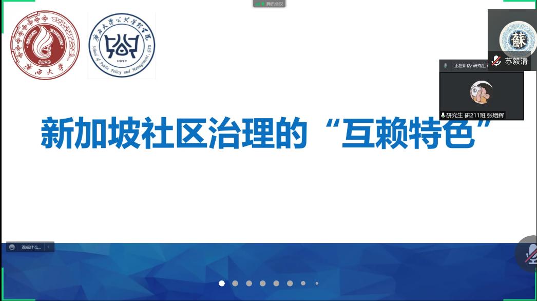 张增辉同学分享的文章题目为《新加坡社区治理的“互赖特色”》,他从选题缘由、理论工具、新加坡社区治理的互赖特色、投稿心得这四个方面进行分享。张增辉同学基于我国加强基层治理体系和治理能力现代化建设的要求以及新加坡社区治理成就对我国基层治理有一定的启示,以期通过研究新加坡社区治理为我国基层治理提供些许有益建议。该文以治理互赖理论为理论工具探讨国家机关与公民社会如何实现平等互惠。文章通过构建新加坡政府与社会的关系结构图、展现新加坡社区建设组织体系、阐述新加坡推动多方参与社区治理的实例,向读者展示了社区建设的核心在于多方参与。新加坡的互赖式社区治理在巩固政府主导地位的同时,增强了社区的发展活力,丰富了社区治理主体与治理方式,实现了政府治理、居民自治与社区自我调节的“互赖”共生,该治理模式对我国基层治理有一定启示。
