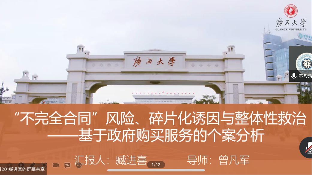 臧进喜同学分享的论文是《“不完全合同”风险、碎片化诱因与整体性救治——基于政府购买服务的个案分析》,她从问题的提出与文献综述、“不完全合同”风险与整体性治理分析框架、“不完全合同”风险的类型、案例分析、政府购买服务“不完全合同”风险的整体性救治策略、撰写心得这六个方面与同学们进行分享。文章围绕以下几个问题展开研究:我国政府购买服务中“不完全合同”风险有何特定的生成逻辑和类型?在管理学层面,合同背后是否具有更深层次的诱发因素?能否构建一套相应的整体性救治方案?臧进喜同学首先阐释“不完全合同”风险及其类型,接着以整体性治理为理论工具构建整体性治理的分析框架,然后以T街道为例探究政府购买服务“不完全合同”风险的碎片化诱因,最后从服务理念、主体网络、制度体系、责任机制、信息技术这五个方面提出了相关的整体性救治策略。