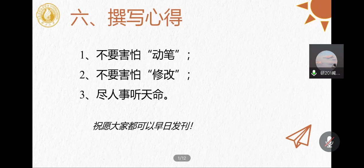 关于撰写心得,臧进喜同学认为:不要害怕“动笔”,脑子里有想法就一定要写下来;不要害怕“修改”,文章很难做到一气呵成,只有不断修改才能有所进步;尽人事听天命,我们把该做的做好,一定不要气馁,一定要坚持不懈!