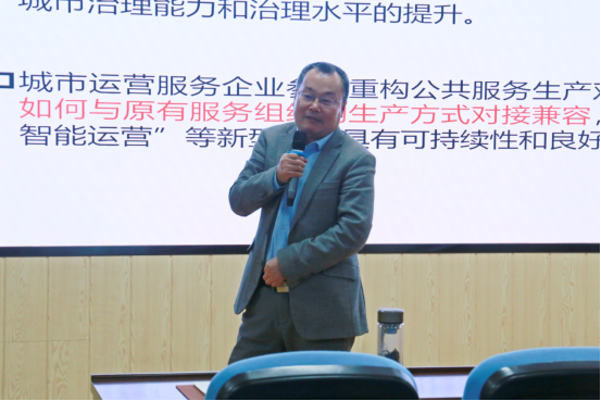 孙教授以万科物业的转型实践为切入点,通过讲故事的方式向在场师生进行汇报分享。首先,他围绕万科物业所提供的全覆盖、多模态的公共服务实践,对全域、智慧治理与服务模式等关键名词进行了详细解读。其次,他以1949、1980、1990为时间节点分别分析了不同时期社会城市服务的变化特点,从城市独特的空间格局变化与内部社会结构分化重组两方面对中国城市转型的若干阶段进行了介绍。
