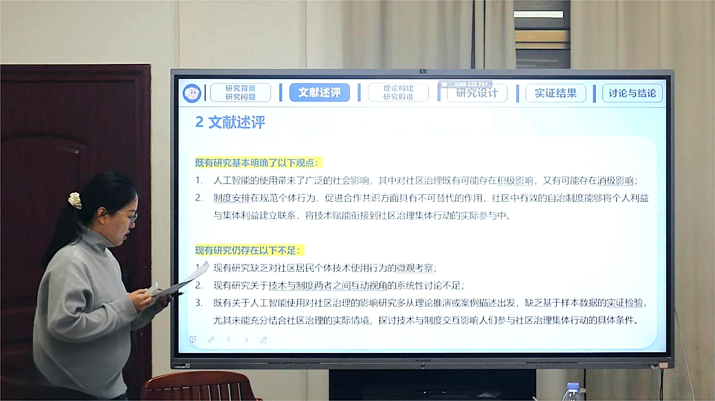 郭贝儿同学的分享主题为《人工智能的使用对居民参与社区治理集体行动的影响——“技术—制度”互动的视角》。研究紧扣人工智能应用场景的实践痛点,聚焦两大核心问题:一是居民使用人工智能工具会对其参与社区治理集体行动产生怎样的影响;二是社区自治制度能否有效调节该影响。研究借鉴并发展了Ostrom提出的社会生态系统(SES)框架,提出了技术-社会-生态系统(T-SES)框架,将人工智能界定为行动者可运用的新型技术工具。研究表明,在不考虑制度因素时,人工智能使用对社区治理集体行动的影响并不显著;而社区自治制度越完善,越能放大人工智能对社区治理集体行动的促进效应。