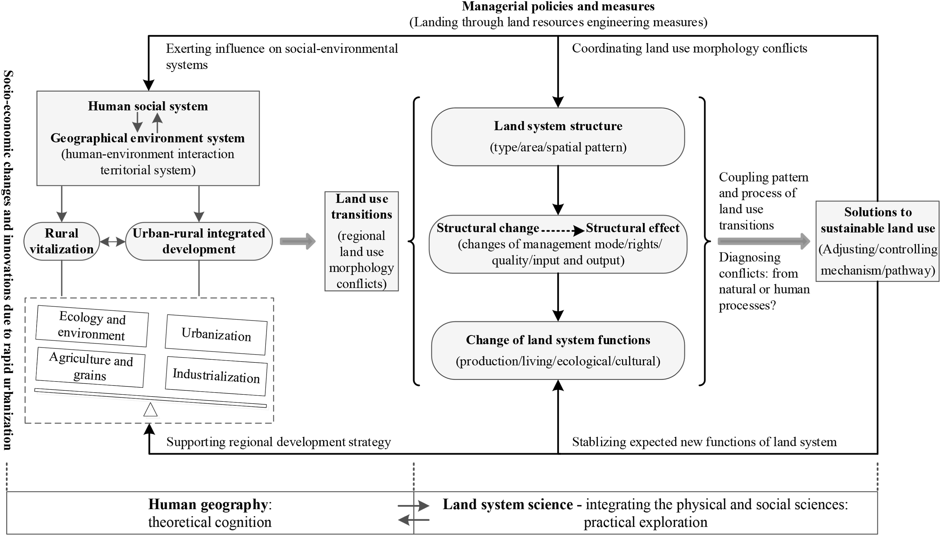 针对这一挑战,本文将人文地理学的人-地关系地域系统理论与中国正在实施的乡村振兴与城乡融合发展战略相结合,提出了区域土地利用转型“冲突-协调”理论模式,并从土地利用形态的变化引起土地系统结构的变化,进而导致土地系统功能的变化,辅以基于格局与过程耦合的土地利用转型调控等三个维度构建了土地利用转型的解释框架,以期增进对土地利用转型与相关区域发展战略的认知,促进土地系统科学的理论建设。
