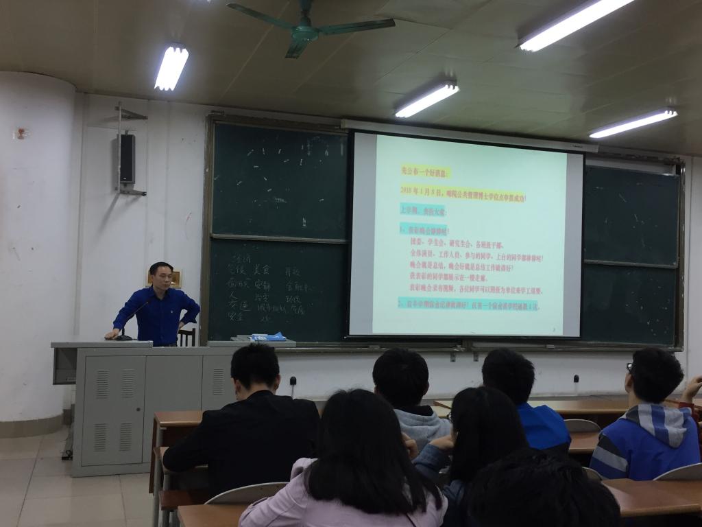 在公布了公共管理博士学位点于2018年1月8日申报成功的好消息后,对同学们在上一学期的努力表现表示肯定和表扬。同时也对新学期提出了新的要求——要重视学风建设,争创一流院风!