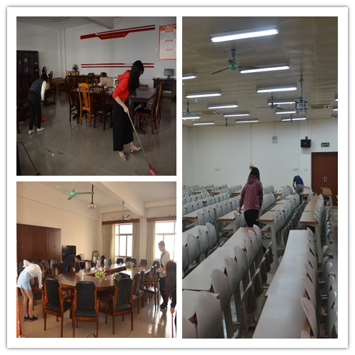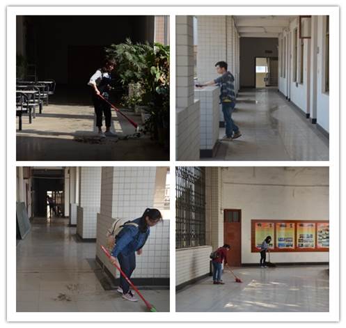 (图为学生党员和志愿者们认真清扫各教室内的卫生死角)