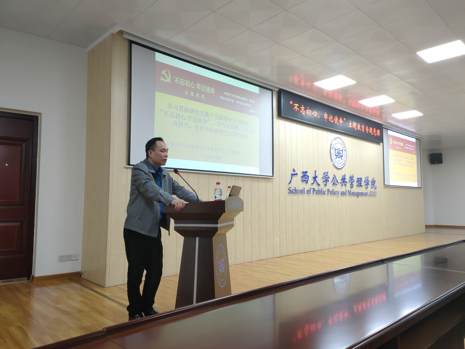 11月29日,太阳城网址 开展“不忘初心、牢记使命”主题教育专题党课,太阳城网址 党委副书记、纪委书记甘武琳以“学习贯彻研究实践党的十九届四中全会精神,“不忘初心、牢记使命”,争当有理想、有信仰、有担当、有作为的新时代大学生党员”为题讲授专题党课。全院预备党员、本科生支部党员和研究生支部党员出席党课。
