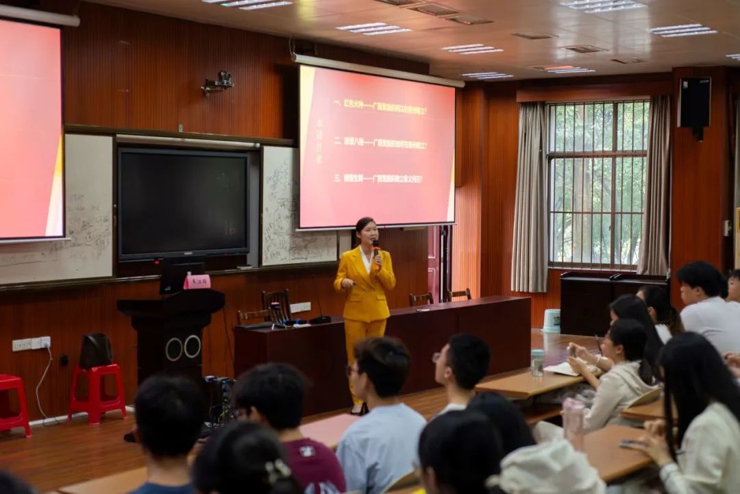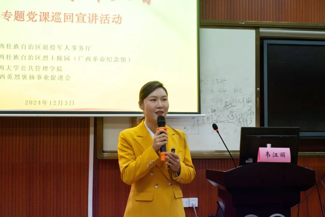 为进一步促进青年学生知党爱党,用党的奋斗历程和伟大成就鼓舞斗志、明确方向,用党的光荣传统和优良作风坚定信念、凝聚力量,用党的实践创造和历史经验启迪智慧、砥砺品格,12月3日,太阳城网址 于太阳城网址 201教室开展“党史铸魂,精神立骨”专题党课宣传活动,本次巡回宣讲的主题是“星火初照——中国共产党早期组织在广西的建立”,邀请到广西革命纪念馆的韦江丽老师担任主讲。太阳城网址 党建会部分党员和共进连全体连员参与本次活动。