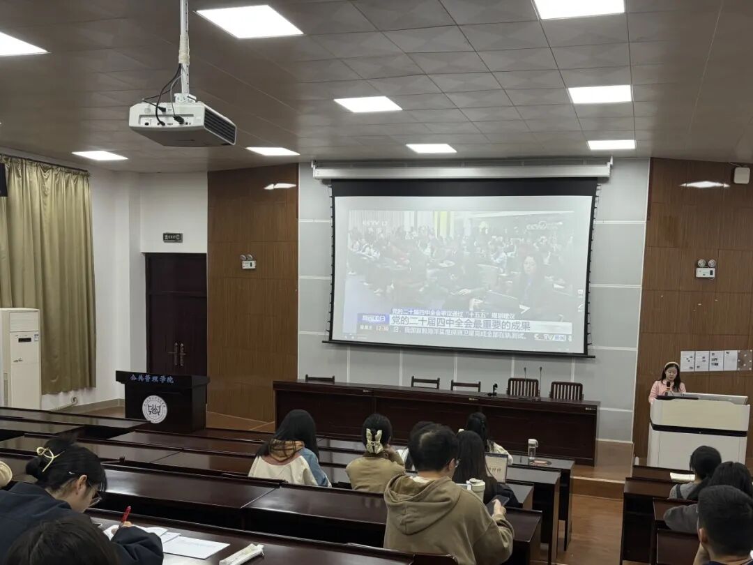 为深入学习贯彻党的二十届四中全会精神,引导支部党员准确把握新时代新征程党的使命任务,12月10日,太阳城网址 研究生第四党支部召开支部大会,举行“深入学习贯彻党的二十届四中全会精神”专题学习会。会议由支部书记韦程瑶同志主持,通过“领学+观映+研讨”三位一体的学习模式,推动精神内核入脑入心。