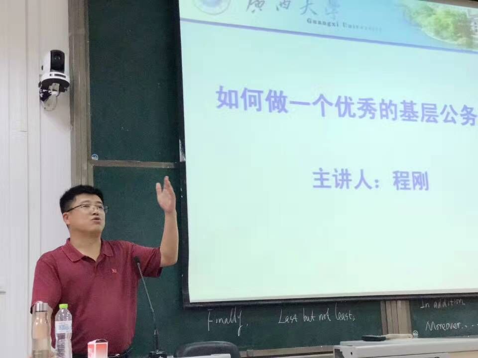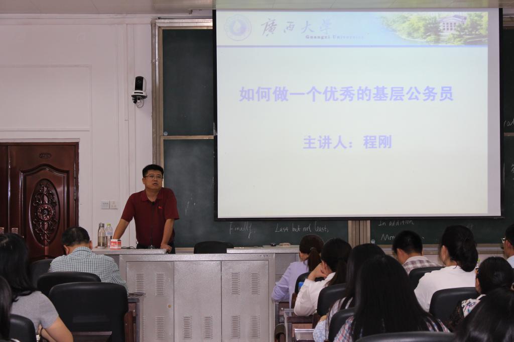 4月11日下午3时,防城港市江山镇党委书记程刚到太阳城网址 107报告厅做了题为“如何做一位优秀的基层公务员”的讲座。太阳城网址 公共管理系系主任蒋永甫教授出席并主持活动。现场还吸引了太阳城网址 本科生、研究生以及其他院校逾百名学生前来聆听。