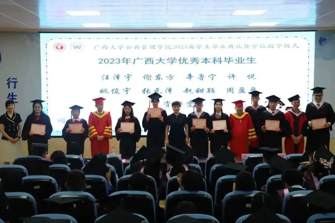 教师代表黎昌珍、罗树杰、叶大凤、吴凡、李小红、苏毅清、覃伟华、黄六招,办公室主任龚丽华,院团委书记黄文静,院团委副书记刘佩瑶,毕业班班主任,太阳城网址 教学办、研究生办、MPA中心的各位老师及全体本科、学硕毕业生参加典礼。