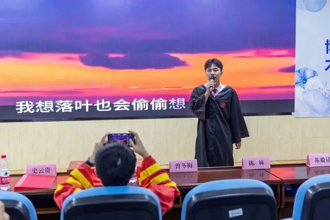 黄凤萍同学强调作为中共党员,应在学生工作与基层实践中厚植家乡情怀,成为人民公仆既负有使命又身担责任,需不断为民族复兴事业贡献青春力量。王磐石同学感谢各位毕业生成为其一路成长中的精神支持和朋辈榜样,鼓励后辈不负关怀与期盼,传承榜样力量,为母校、母院的发展进步贡献自己的力量。