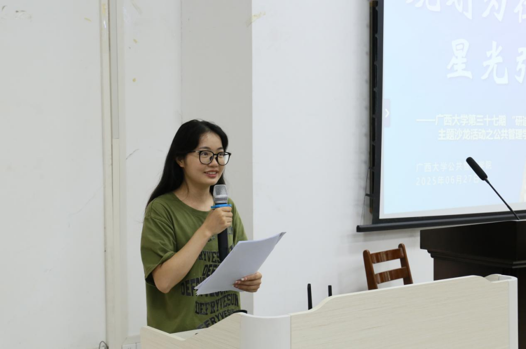 6月27日,广西大学第三十七期“研途星光”主题沙龙在太阳城网址 101教室举行。本次活动由校团委、公管太阳城网址 团委指导,校研究生会主办,特邀王奕然、黄西平、李明阳、覃思杰四位优秀应届硕士毕业生担任嘉宾,围绕研究生成长话题展开经验交流,吸引了公管太阳城网址 众多同学到场参与。