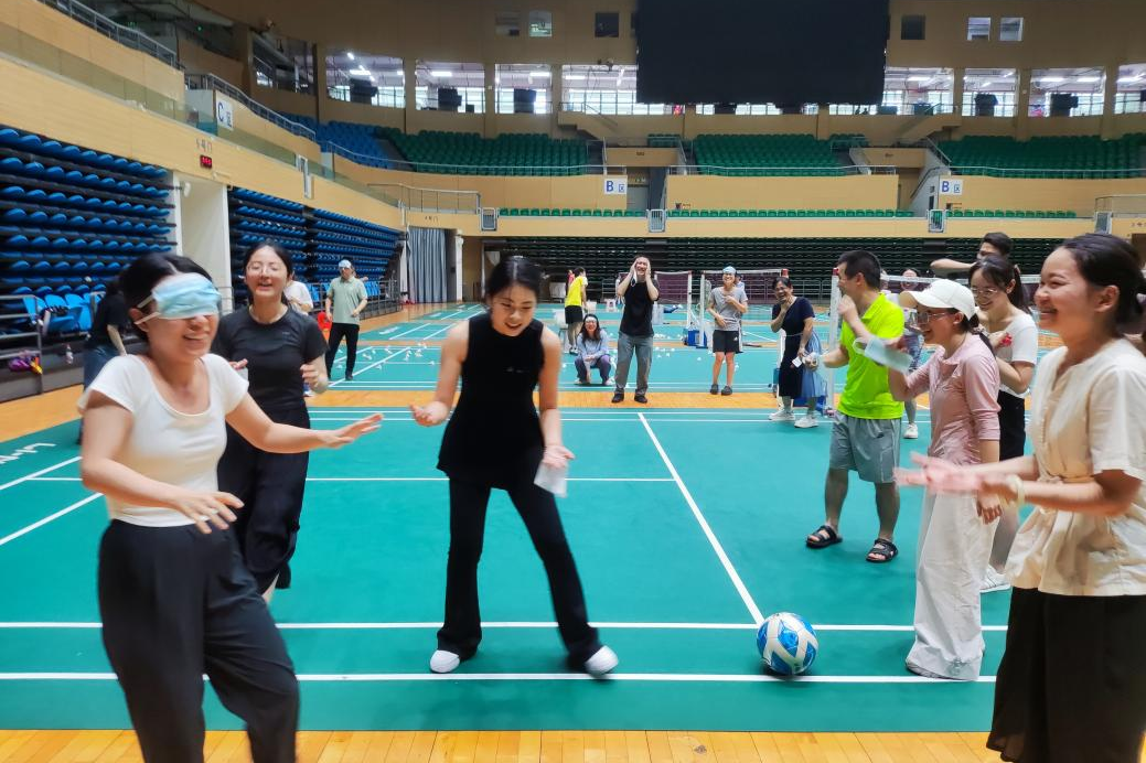 蒙眼踢球环节同样热度高涨。队员蒙眼后,全凭队友的声音指引在场地中探寻足球、瞄准球门。那些指令清晰、执行果断的队伍,总能精准完成射门;而指挥混乱的队伍常出现踢空、踢偏的状况,场边加油声、调侃声与欢笑声交织在一起,将现场氛围推向高潮。