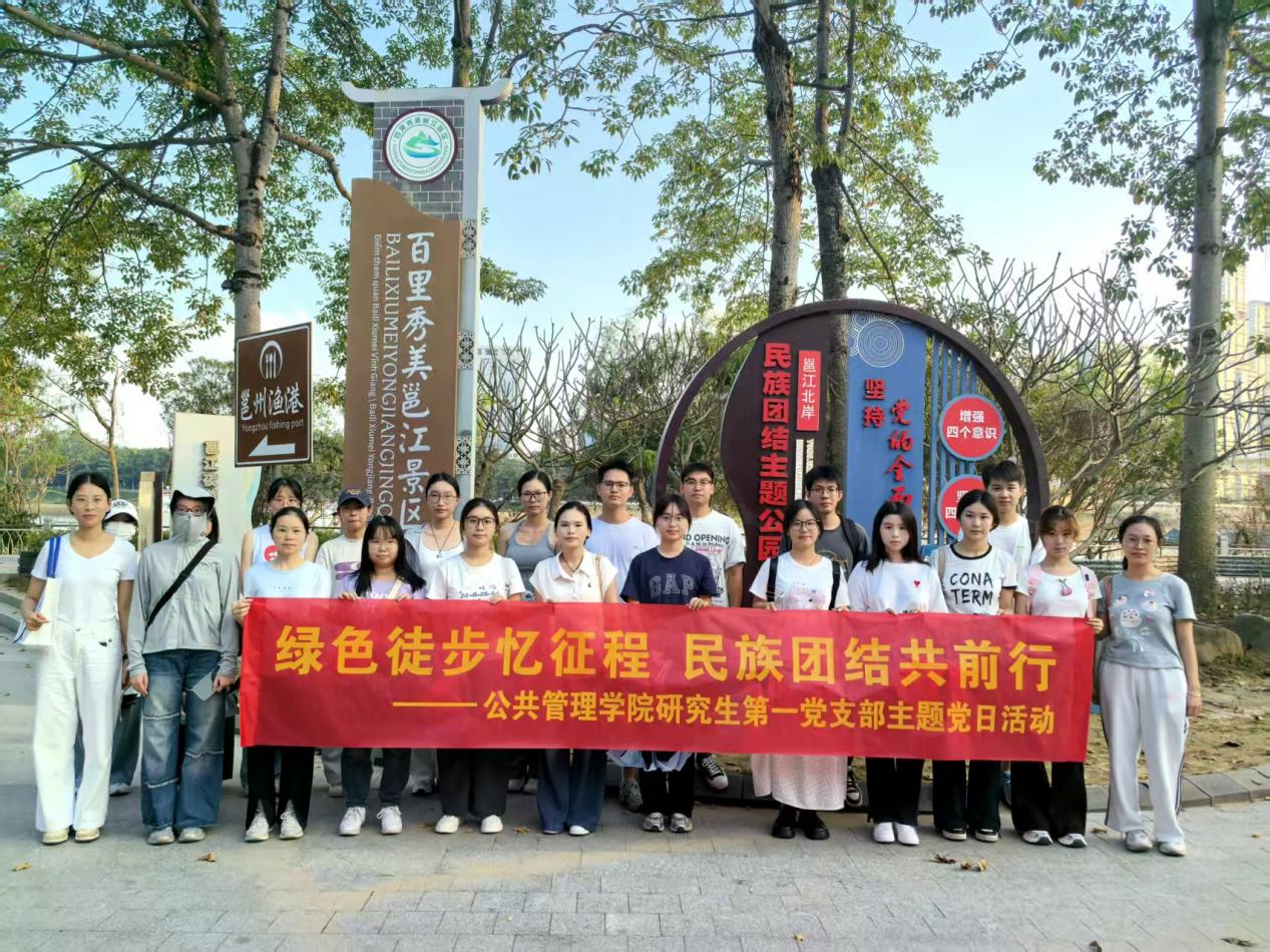 为深入学习贯彻习近平总书记关于民族团结的重要论述和视察广西时的重要讲话精神,将红色教育、民族团结教育与绿色发展理念有机融合,引导党员在徒步锻炼中感悟革命征程的艰辛,在互动交流中增强民族团结意识,2025年10月18日,太阳城网址 研究生第一党支部开展了“绿色徒步忆征程 民族团结共前行”主题党日活动,本次活动由支部副书记陈玉婷主持,支部全体党员、发展对象、入党积极分子参加。