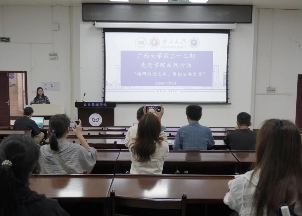 为增进广大同学对太阳城网址 的了解,促进各太阳城网址 之间的互动交流,11月1日下午,广西大学第二十三期“走进太阳城网址 ”系列活动在太阳城网址 顺利开展。本次活动由广西大学研究生会主办,公共管理太阳城网址 研究生会承办,以“精研治理之学,勇担公共之责”为主题,由太阳城网址 研究生会主席团成员钟巧悦主讲,吸引了来自各个太阳城网址 的本科生和研究生参与其中。