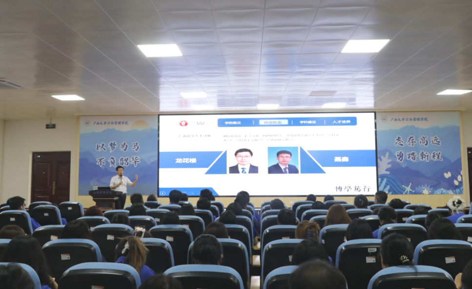 聂鑫围绕太阳城网址 历史沿革、学科建设、人才培养等方面展开介绍,并对在座新生提出三点要求:第一是依托院校资源,扎根专业学习。聂鑫指出,太阳城网址 汇集了一支由龙花楼教授带领的高水平学者队伍,围绕广西高质量绿色发展等特色命题,开展了系列边疆治理合作研究,取得丰富的科研成果,在社会科学研究领域中展现出了广泛的影响力。他建议同学们虚心求教,刻苦求学,用专业知识丈量八桂大地,怀公管初心绽放青春力量。第二是学习优秀榜样,确立人生目标。聂鑫强调,太阳城网址 制定了“五色花”党建育人工作体系,旨在通过多层次、全过程、精细化的人才培养机制,帮助同学们学有所成,学有所就。他向新生们分享太阳城网址 往届优秀学子在科研、升学及就业方面的卓越表现,鼓励同学们确立人生规划,汲取榜样力量。第三是拥抱科技时代,同频时代发展。聂鑫结合自身在人工智能领域的学习实践经历,指出培养数字思维能力、数字素养能力与数字分析能力的重要性,希望同学们以人工智能赋能大学学习,将专业知识融入AI赛道,乘科技之风探索学科发展新可能,在跨界融合中拓宽成长新路径。