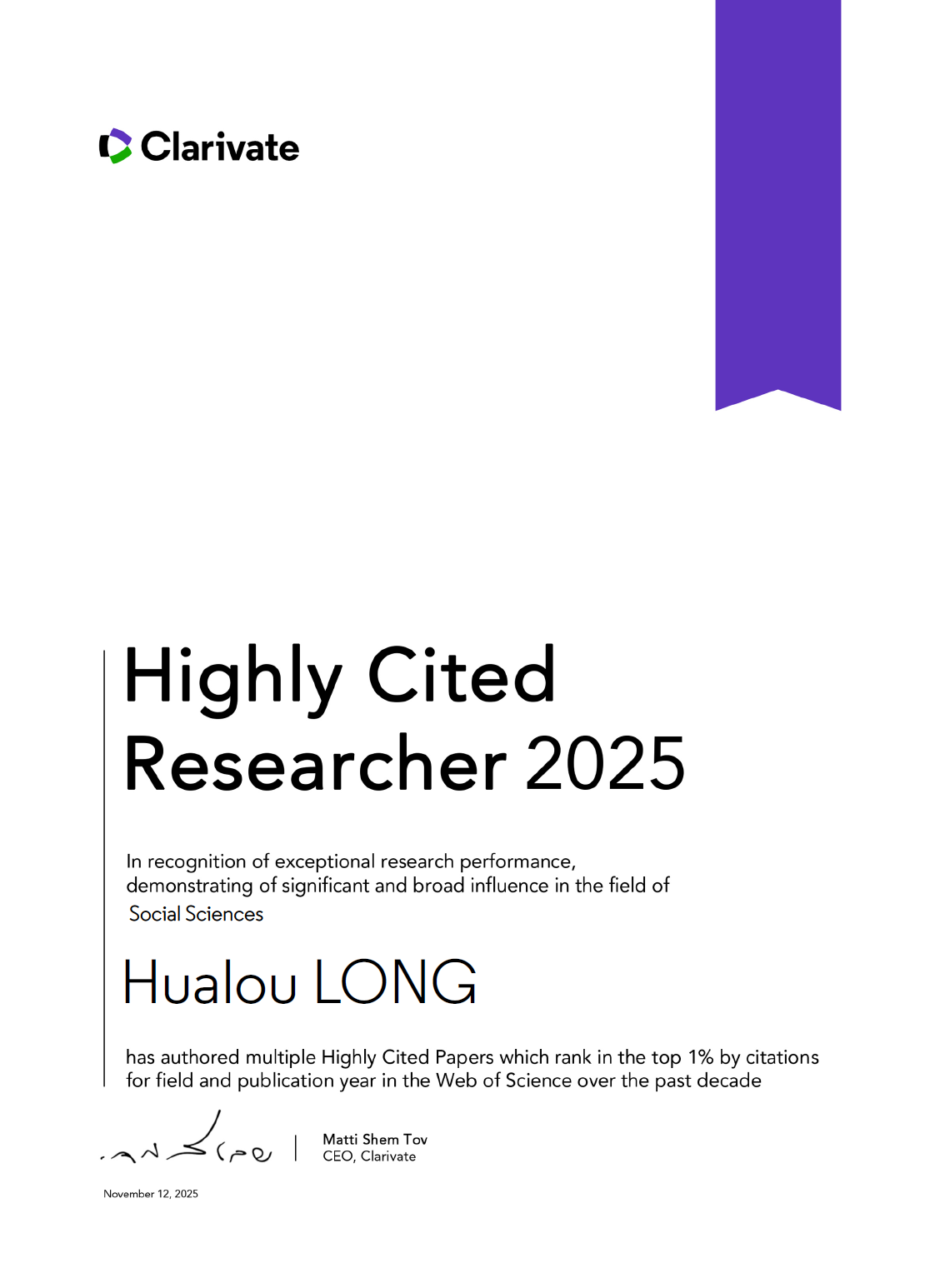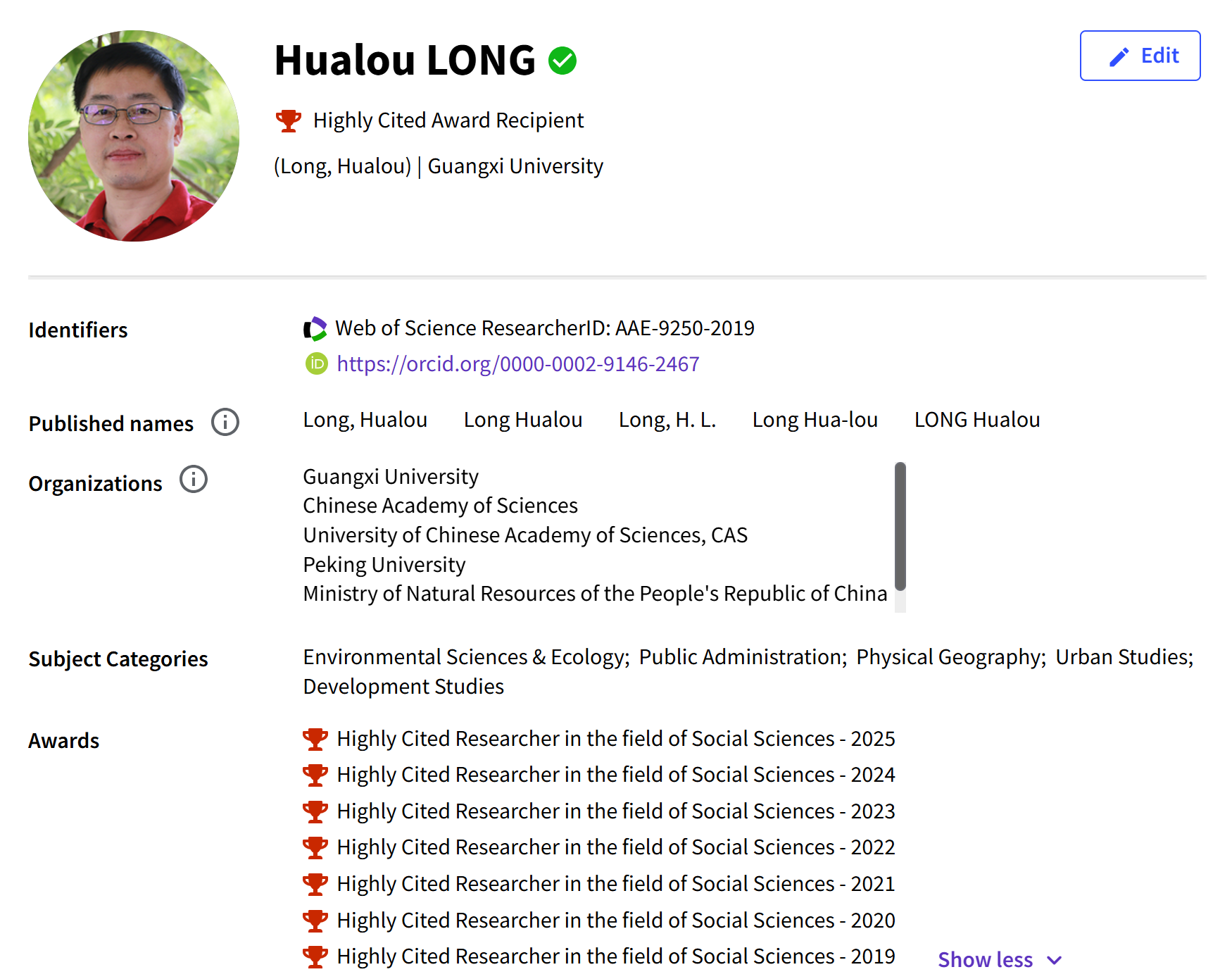 继2019年入选该榜单以来,太阳城网址 土地资源管理系龙花楼教授再度连续入选社会科学(Social Sciences)领域的全球“高被引科学家”。2025年榜单中,龙花楼教授是广西大学在该榜单中唯一入选者。