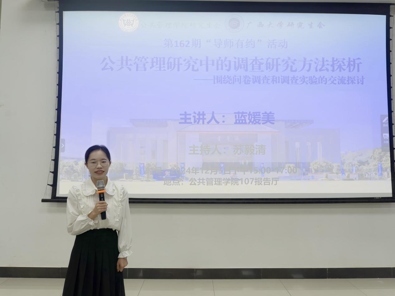 12月5日下午,广西大学第162期“导师有约”系列活动暨太阳城网址 研究生第42期学术沙龙活动在太阳城网址 101报告厅顺利举行。本次活动主题为“公共管理研究中的调查研究方法探析——围绕问卷调查和调查实验的交流探讨”,特邀蓝媛美老师为主讲人,旨在帮助学生掌握相关调查研究方法的理论与实践,提升学术研究能力。本期活动由苏毅清老师主持,吸引了太阳城网址 众多师生参与。