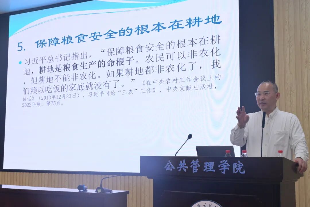 李国祥教授率先开讲,他首先厘清了国际与国内粮食安全定义的本质差异,为在场师生搭建了理解中国特色粮食安全体系的关键框架。其次,他深入拆解了我国粮食安全“供给端保障”的三大支柱,系统阐释了习近平总书记“大食物观”的丰富内涵,还结合疫情防控、俄乌冲突等典型场景,深刻剖析恩格尔系数波动与国家粮食安全战略调整的内在逻辑。最后,他聚焦粮食安全与土地关系的核心矛盾,为相关领域的师生提供了丰富的研究切入点。