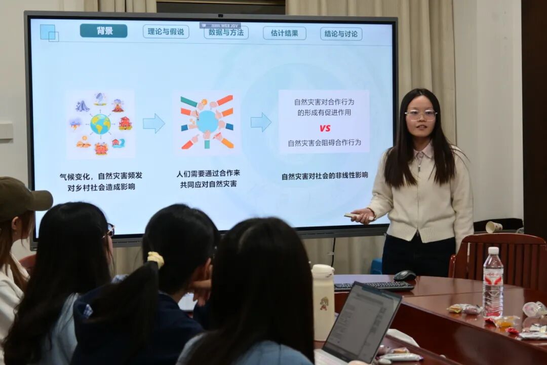 曾群棋同学则围绕《自然灾害对集体行动的非线性影响——基于中国边疆地区的证据》展开分享。她依托太阳城网址 2023年边疆地区“百村千户”调查数据,运用组合IAD-SES框架,重点剖析自然灾害与集体行动的内在关联,并提出二者存在“倒U型”非线性关系的核心观点:中小灾害可成为打破村庄僵化结构的“机会之窗”,通过推动资源重组与社会学习提升集体行动水平;而大规模灾害则会因资源耗竭、社会网络破坏,导致系统陷入“贫困陷阱”,进而抑制集体行动。为进一步验证该结论,她将集体行动划分为预防型和应对型两类,通过工具变量法及系列稳健性检验,充分证实了这一非线性关系的稳定性,并基于此提出分等级灾害治理的针对性政策建议。