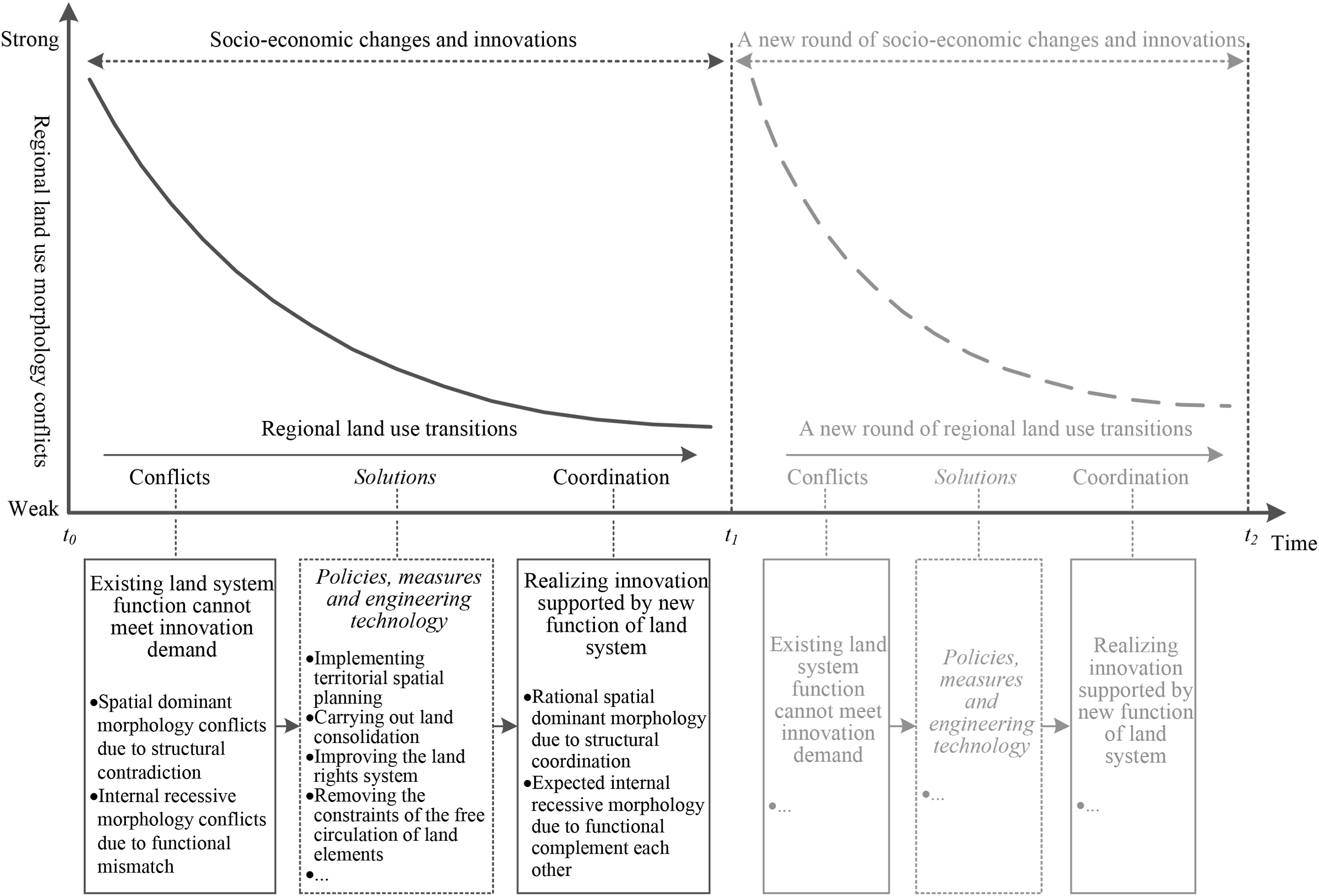 针对这一挑战,本文将人文地理学的人-地关系地域系统理论与中国正在实施的乡村振兴与城乡融合发展战略相结合,提出了区域土地利用转型“冲突-协调”理论模式,并从土地利用形态的变化引起土地系统结构的变化,进而导致土地系统功能的变化,辅以基于格局与过程耦合的土地利用转型调控等三个维度构建了土地利用转型的解释框架,以期增进对土地利用转型与相关区域发展战略的认知,促进土地系统科学的理论建设。