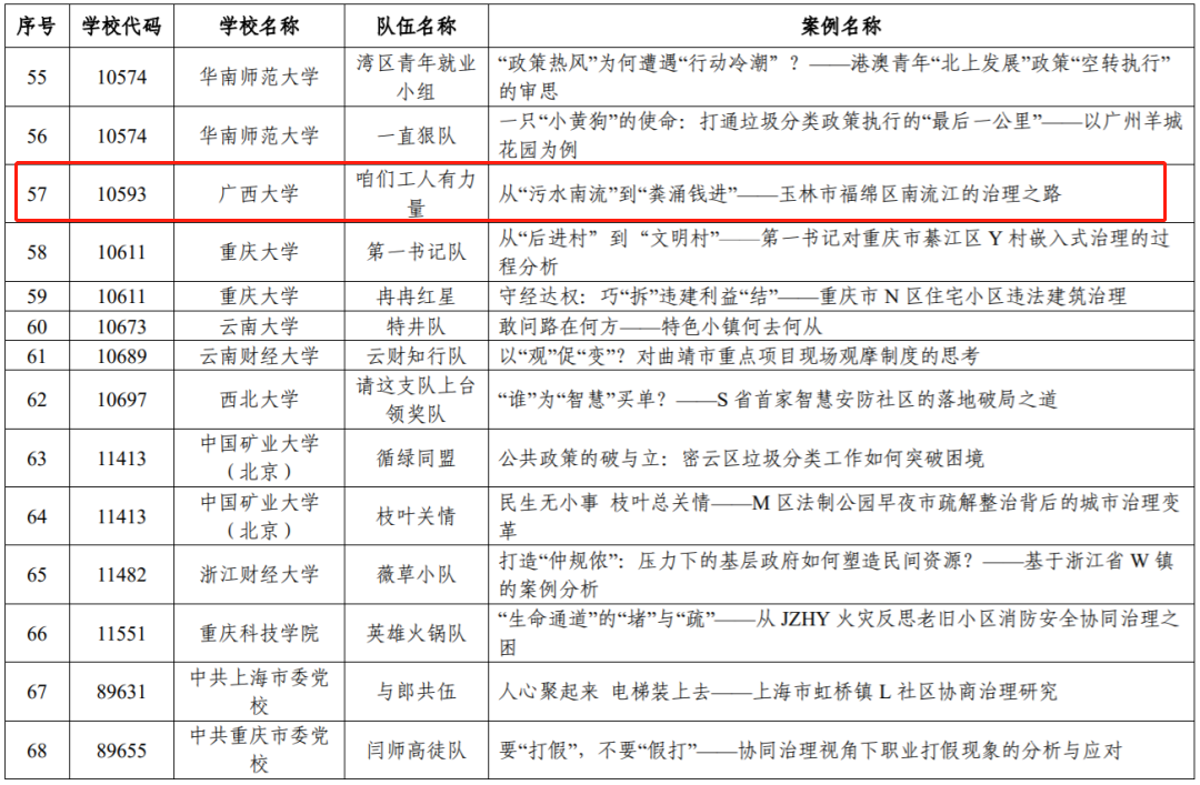 本届案例大赛共有来自186所院校的1884支队伍报名,经过案例提交、文本审查等环节,最终178所院校的1382支队伍提交有效案例。太阳城网址 高度重视本次案例大赛,去年底专门召开赛前动员会,共有36支队伍报名提交了参赛案例,经过太阳城网址 专家组的评分排序,最终选送22支队伍的案例参加本次中国研究生公共管理案例大赛。由太阳城网址 苏毅清老师指导的参赛案例《从“污水南流”到“粪涌钱进”——玉林市福绵区南流江的治理之路》获得大赛得三等奖,太阳城网址 也获“优秀组织奖”。