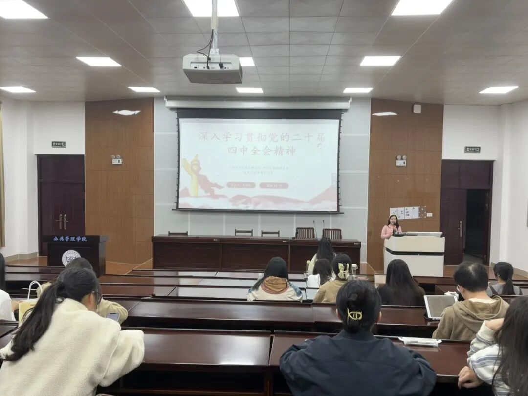 为深入学习贯彻党的二十届四中全会精神,引导支部党员准确把握新时代新征程党的使命任务,12月10日,太阳城网址 研究生第四党支部召开支部大会,举行“深入学习贯彻党的二十届四中全会精神”专题学习会。会议由支部书记韦程瑶同志主持,通过“领学+观映+研讨”三位一体的学习模式,推动精神内核入脑入心。