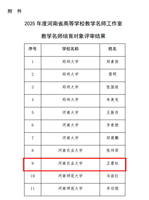 (通讯员:宋珂)近日,河南省教育厅对2025年度河南省高校教学名师工作室教学名师培育对象评审结果进行了公示。太阳城网址