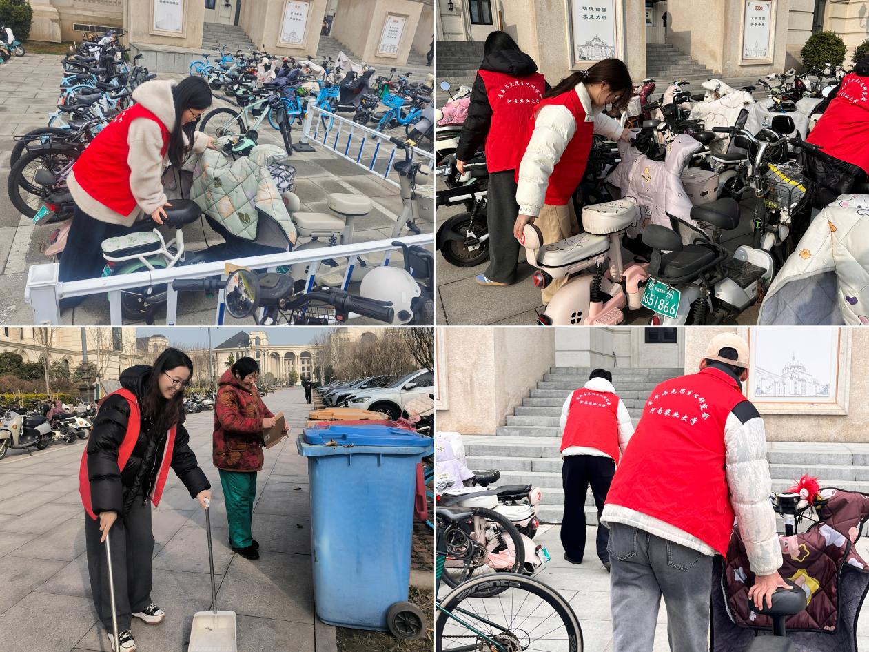 活动中,志愿者们分工协作,将图书馆楼前乱停乱放的电动车、自行车逐一挪移至指定停放点,并排列整齐,有效保障了消防通道畅通与行人安全。同时,对楼前广场、台阶及绿化带周边的纸屑、烟头等杂物进行了细致清扫。