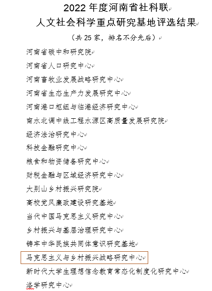 马克思主义与乡村振兴战略研究中心是2022年获得河南省社科联批准的河南省人文社会科学重点研究基地,该基地以马克思主义理论研究为基础,以乡村振兴为时代大背景,以马克思主义基本原理与文本研究为基础,探索马克思主义经典作家的思想演化逻辑,聚焦新时代政治、经济、伦理、生态等问题,探索农村改革与现代化建设的思想演化逻辑,聚焦新时代政治、经济、文化、生态等问题,在农村集体产权制度改革研究,乡村文化与精神文明建设,农村耕地流转政策,农村宅基地“三权分置”改革等研究领域深耕细作,特色鲜明。该基地始终把马克思主义基础理论同中国具体实际相结合,开展重大的理论和实践问题研究。一是注重马克思主义基本理论和基本方法的研究,考察马克思主义中国化的历史进程,开展马克思主义经典著作文本的解读与阐释。二是注重马克思主义“三农”理论研究,关注我国改革开放和现代社会主义建设过程中农村产生的新情况、新问题的研究。三是深入对马克思主义面临世界多极化、经济全球化所提出的新课题和新挑战的研究。近年来,团队成员主持和参与国家社科基金项目和省部级课题30余项,取得省级以上科研、教研成果19项,在人民出版社等权威出版社出版著作10部,发表在《当代世界与社会主义》《社会主义研究》《毛泽东邓小平理论研究》等权威期刊论文60余篇。