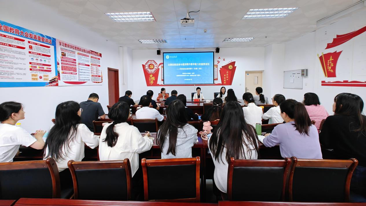 陈娱以《以赛促教是青年教师提升教学能力的重要途径》为题做了专题报告,同时从评委的视角对青年教师肖园丽的说课视频进行了精彩点评,肯定其优异表现的同时,并针对课件制作、教材分析等方面提出了建设性意见。此外,陈娱还详细解读了青年教师比赛的相关问题,结合赛前准备、教学展示等环节,提供了理论指导和实践创新思路,对思政课教学水平的提升起到了促进作用。